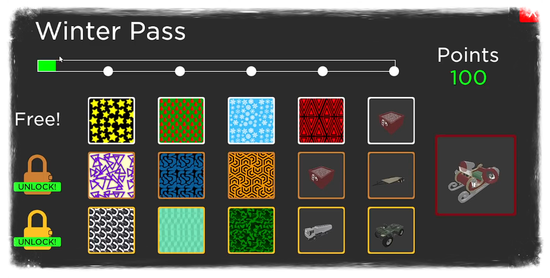 Consisted of 3 main event lines, one free pass, and 2 premium, one more expensive than the other. You were rewarded the sleigh for completing any of the 3 but more passes gave you more rewards. In total there were 10 vehicle skins, 2 boxes of candy cane seed and 4 vehicles available, one of which (ATV) is now available for robux as a premium vehicle, but the others highly seen after. You also got 3 free boxes of balsam seeds which you had to chop and redeem to get the prizes within the event.