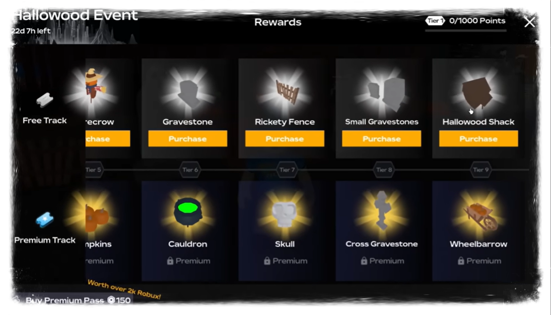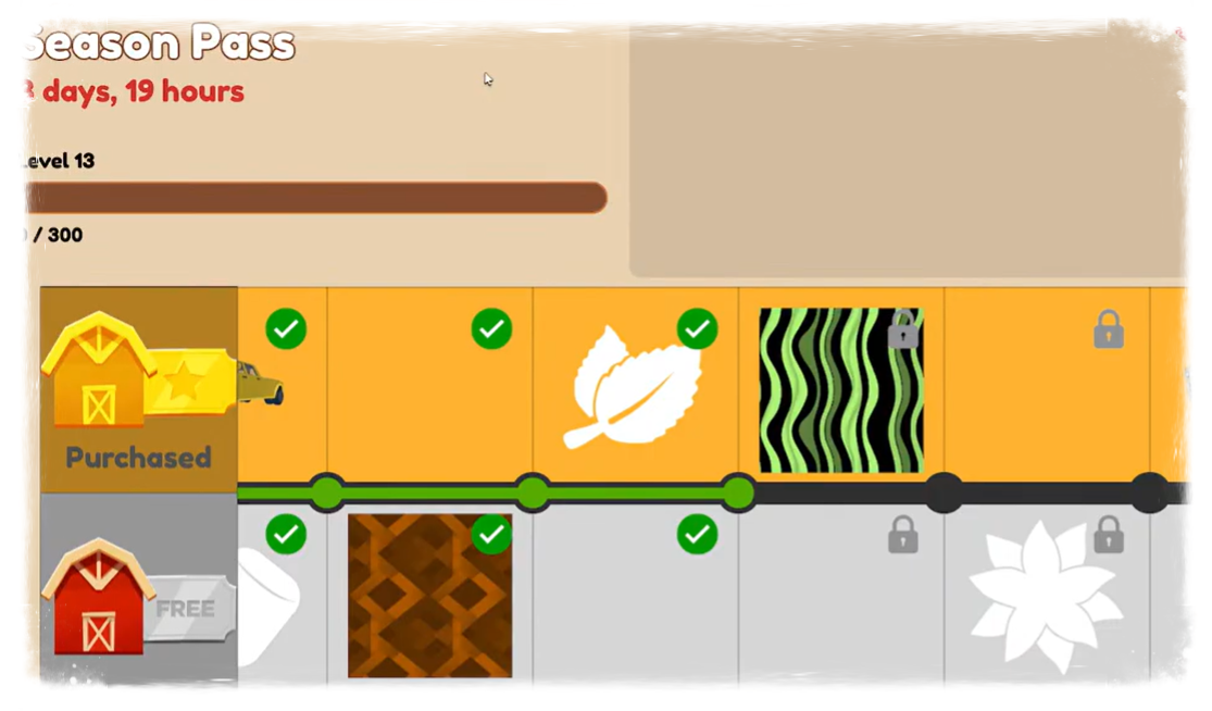 This event was unique. The way of gaining xp was the first minigame like thing in farming and friends. To gain xp, you had to chop trees but with that, you had the added bonus of getting 1 of 5 seed boxes. Some common and some very rare. On the topic of what the xp gave you was quite unique. There were no vehicles but all decor products. Again more hidden behind a premium pass costing robux.